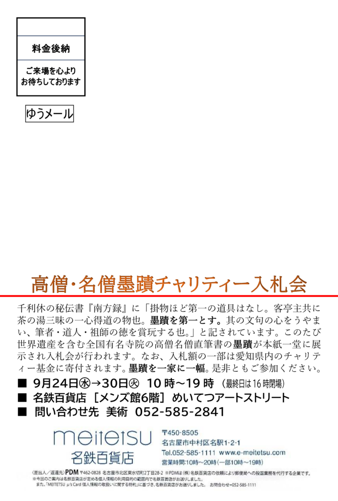 このたび上記のように、愛知県名古屋市の名鉄百貨店さんで当法人主催のチャリティー墨蹟展を開催させていただく運びとなりました。久々の大会場での開催で出展数は過去最大級を予定しています。前身の認定NPO法人夢・同人からお預かりしているご作品とその後を受け継いだNPO法人文華舎に御恵贈いただいた墨蹟をできるだけ多く出展したいと思います。また、収益から一部は社会福祉向上を願って、中日新聞社会事業団様に寄付させていただく所存です。