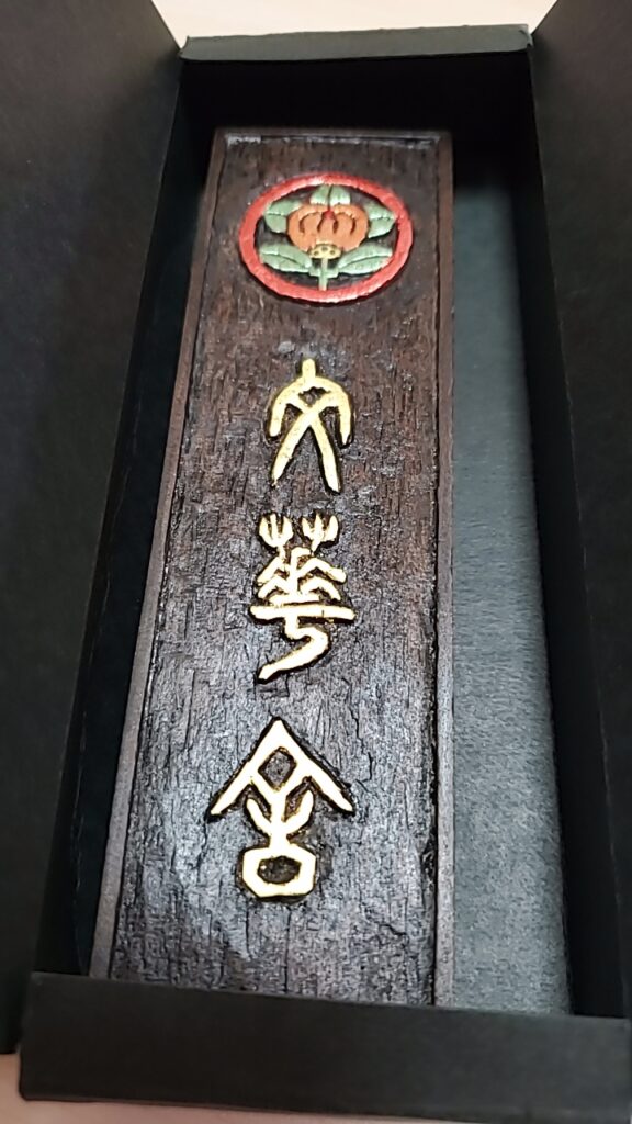 このご作品は刻字作家の深田虹心先生からいただいた「文華舎」の表札です。私の撮影の能力が乏しいのでうまく反映されていませんが、彩色された井伊家の橘の家紋がキラキラなんです。どうすればこんなことになるのやら、本当に素晴らしい技術です。かしこまり。